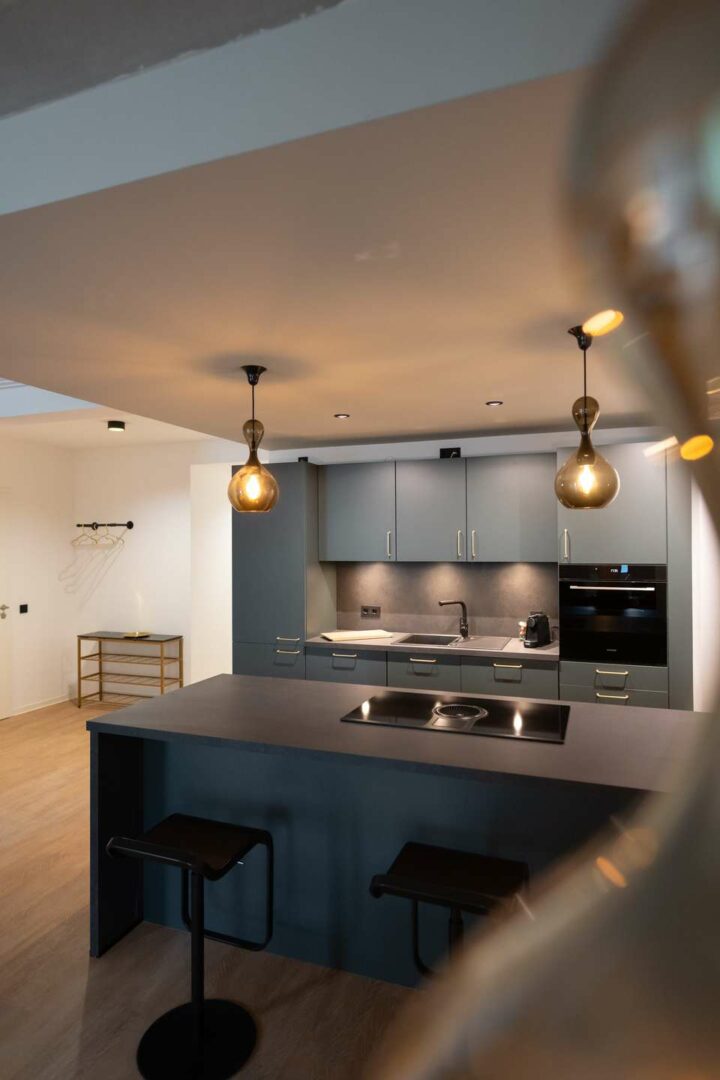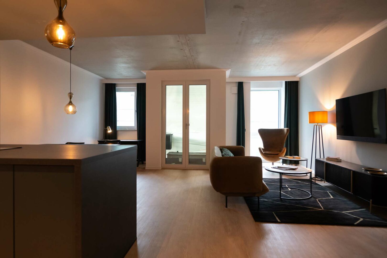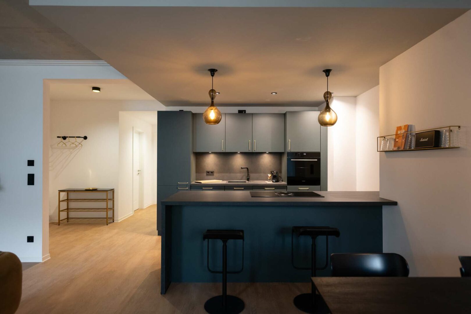 Der Wohnbereich besticht durch weiß gekalkten Vinylboden, der in Kombination mit einer Art-déco-Tapete für ein modernes und zugleich wohnliches Ambiente sorgt. Die harmonisch integrierte Küche erfüllt höchste Ansprüche an Komfort und Design.
