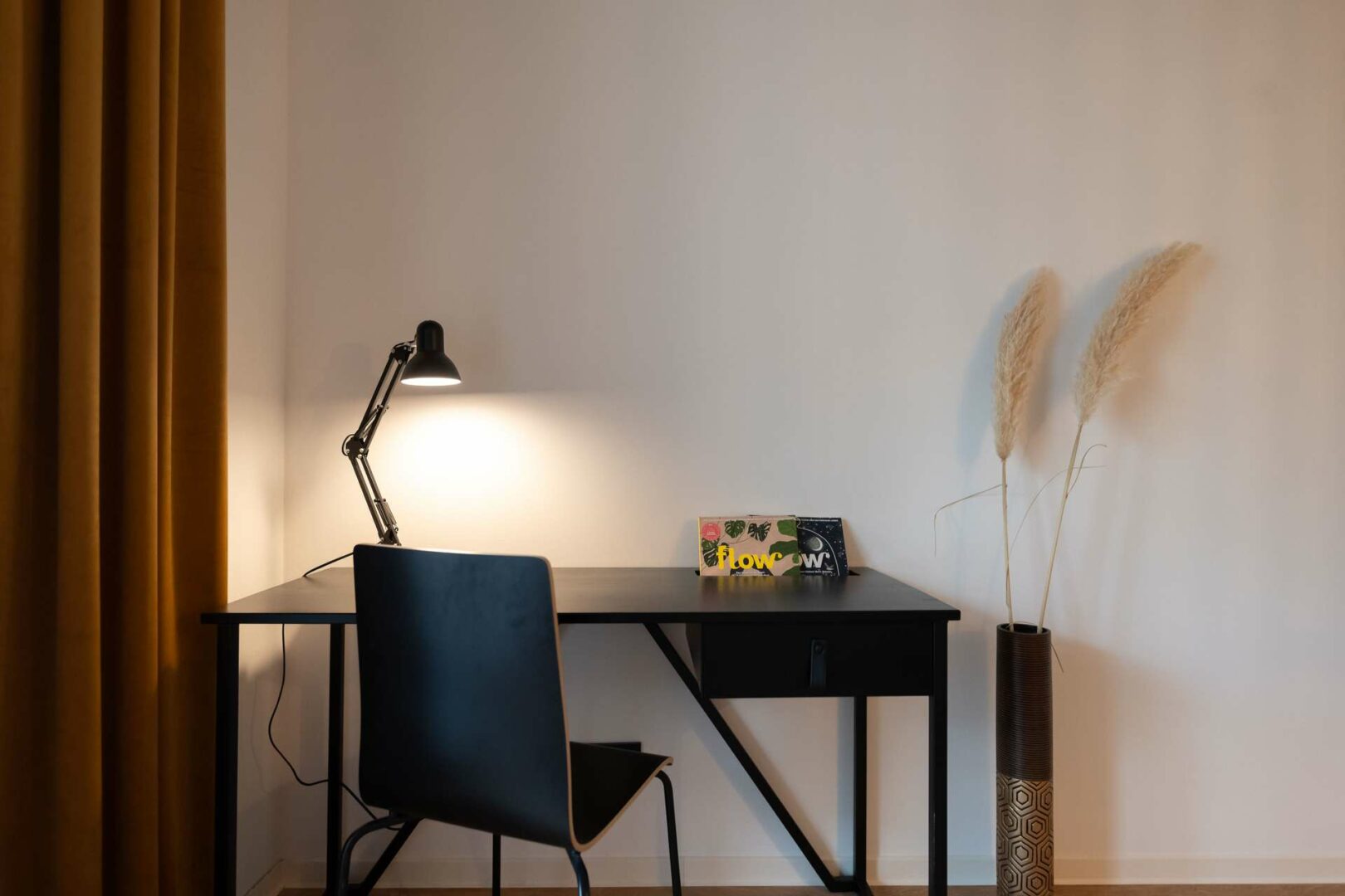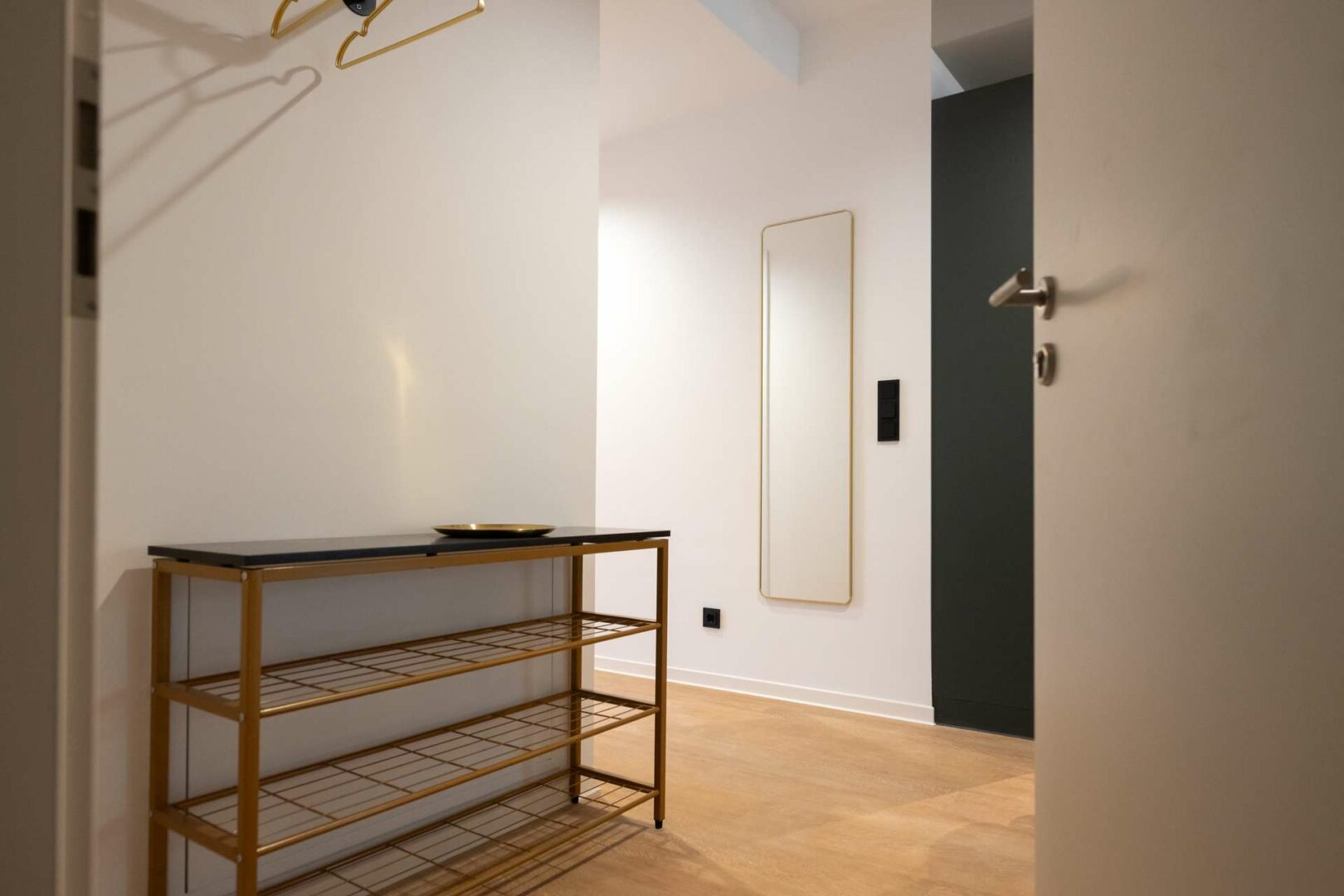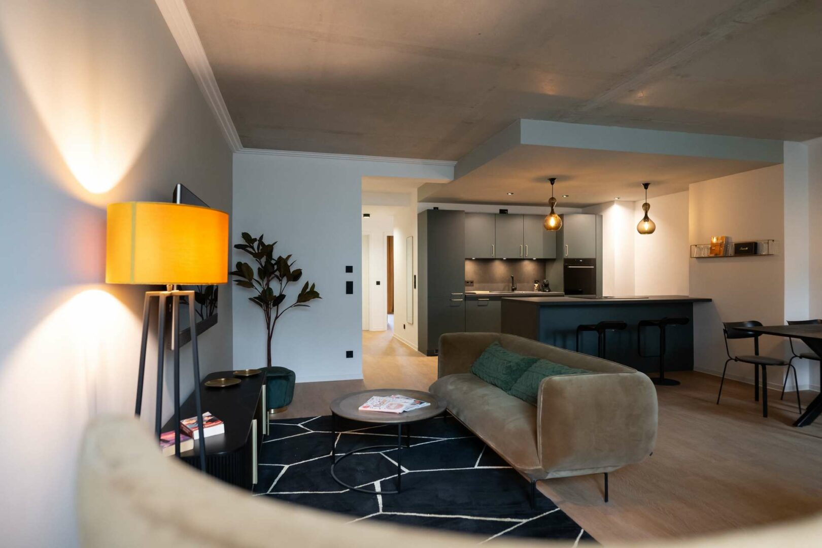 Der Wohnbereich besticht durch weiß gekalkten Vinylboden, der in Kombination mit einer Art-déco-Tapete für ein modernes und zugleich wohnliches Ambiente sorgt. Die harmonisch integrierte Küche erfüllt höchste Ansprüche an Komfort und Design.