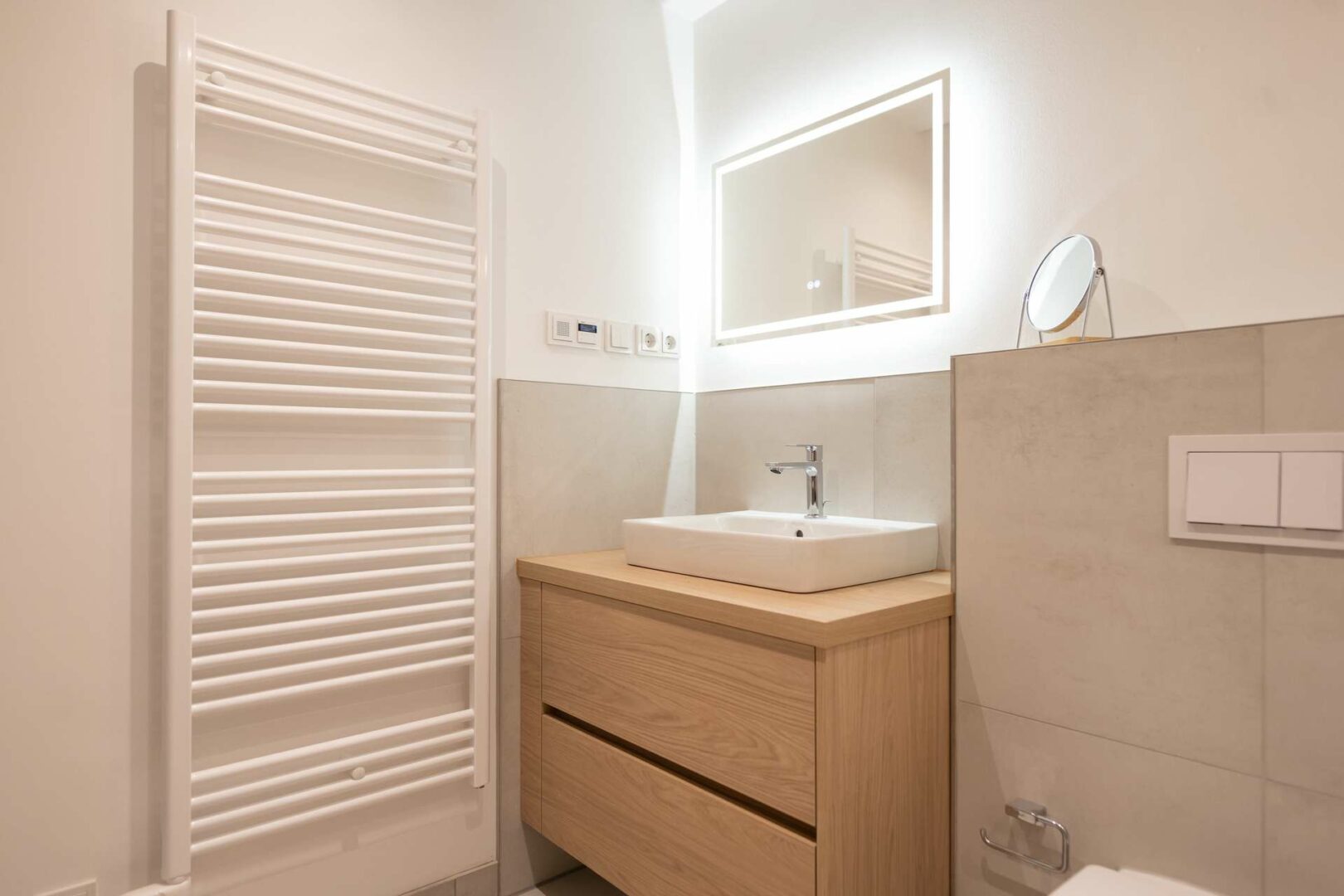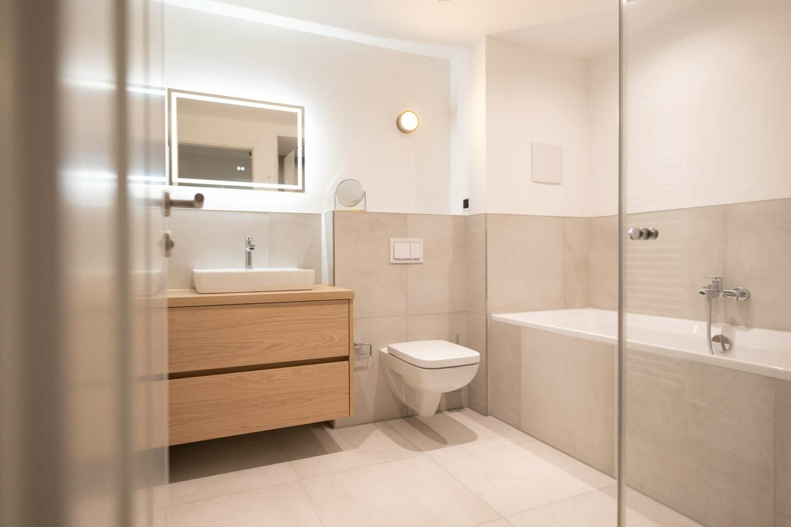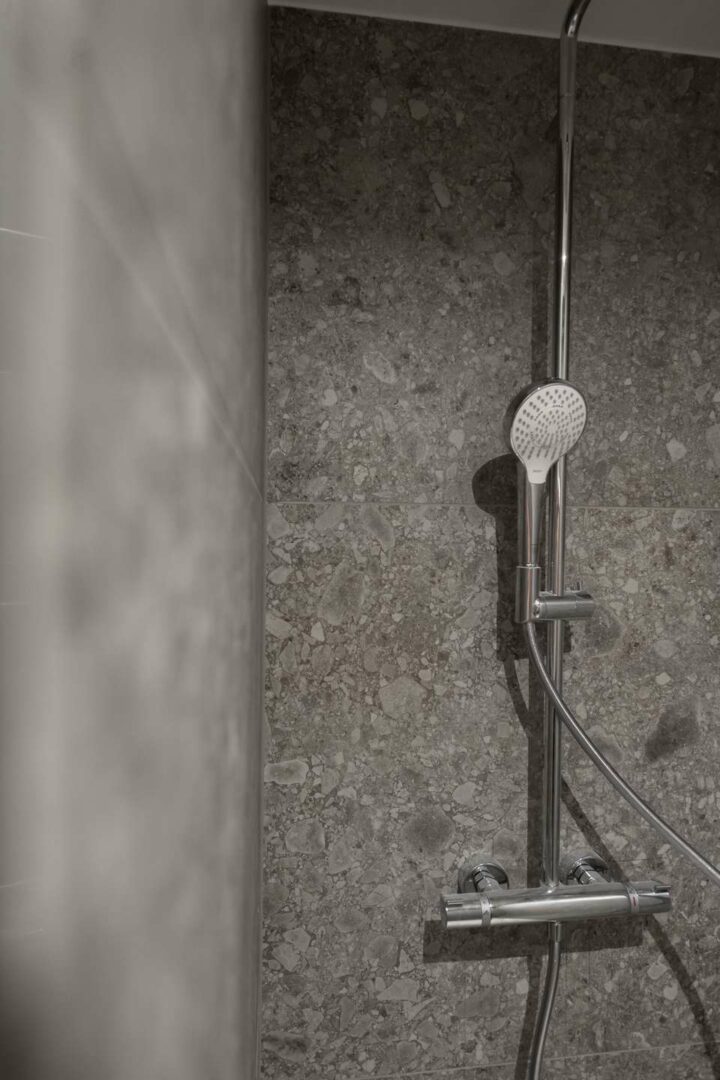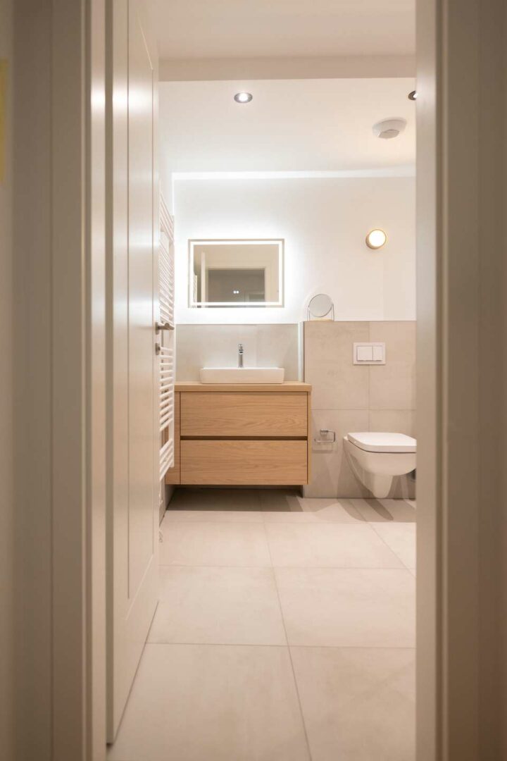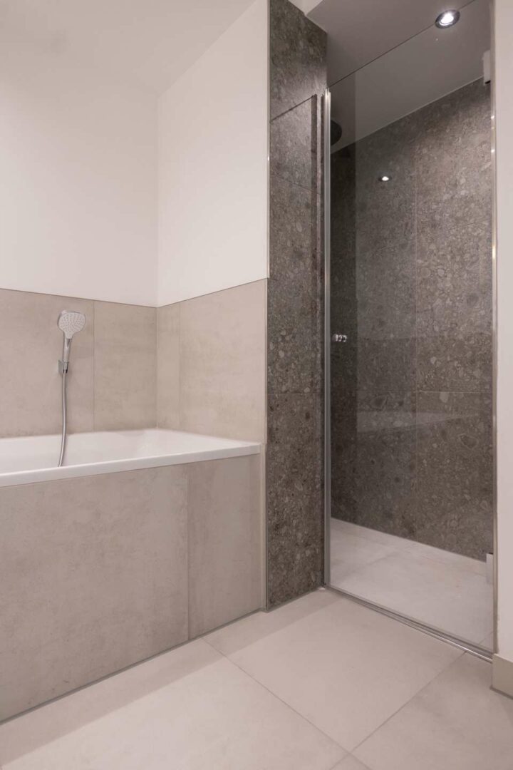 Das Badezimmer ist hochwertig ausgestattet, mit eleganten Armaturen und einer bodengleichen Dusche mit deckenhoher Glasabtrennung.