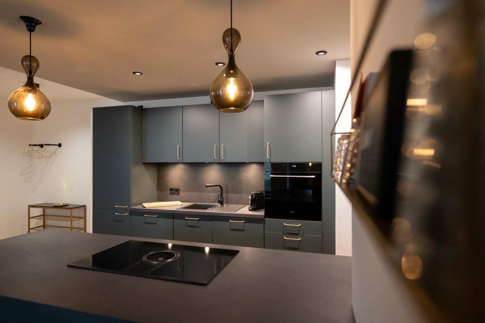 Die Küche ist harmonisch in den Wohnbereich integriert. Das Badezimmer bietet hochwertige Armaturen sowie eine moderne Dusche mit deckenhoher Glasabtrennung.