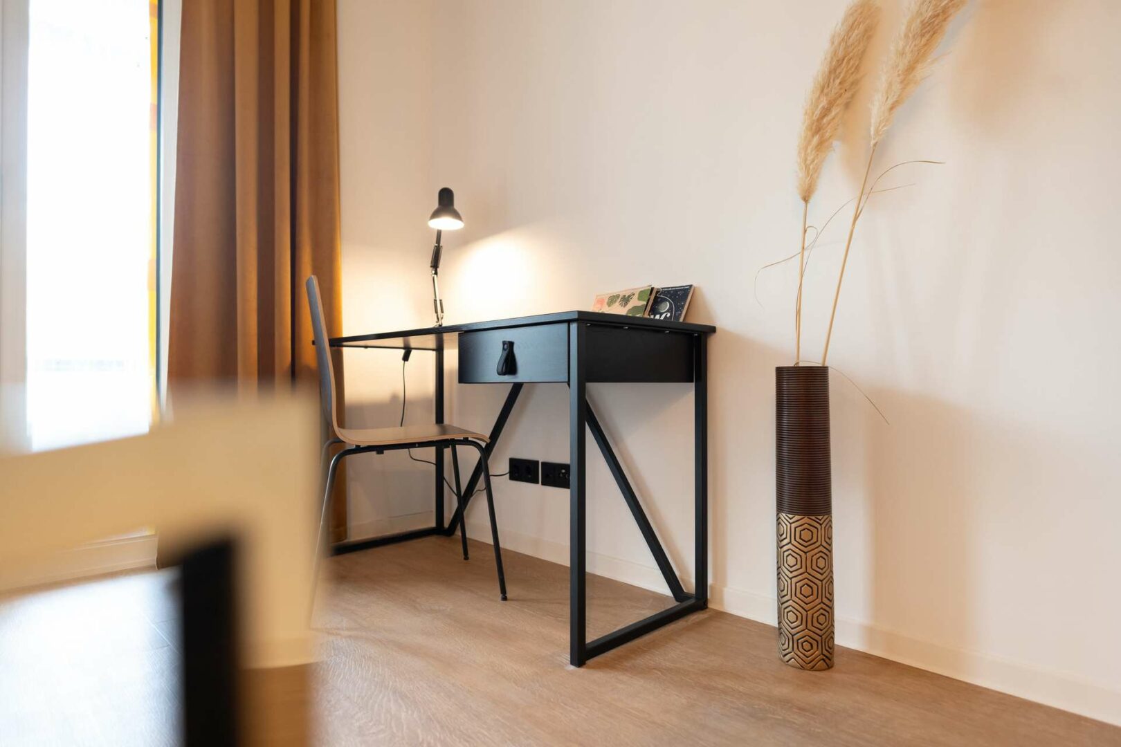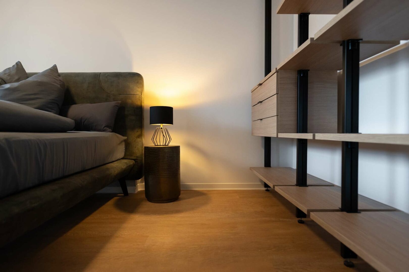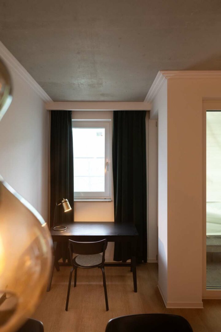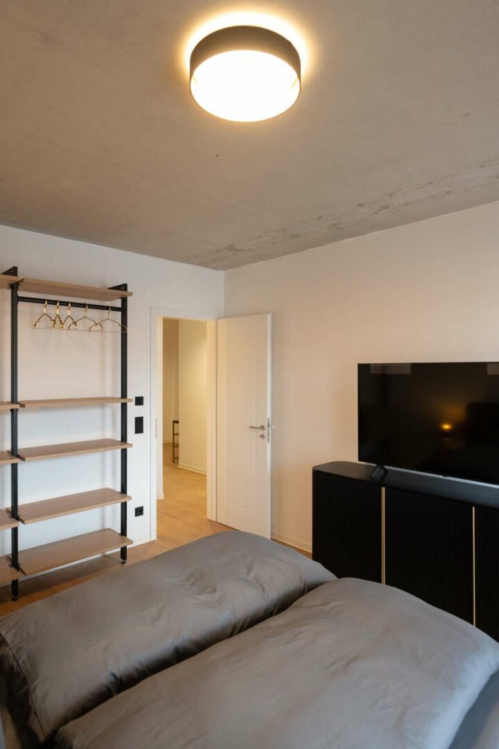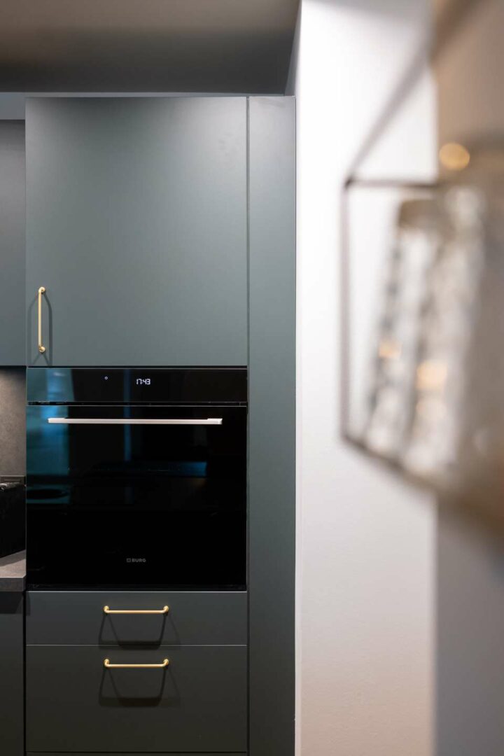 Die Wohnung überzeugt durch eine klare Raumstruktur und exklusive Ausstattungsdetails. Maßgefertigte Einbauschränke sowie ein stilvolles Sideboard sorgen für ein hochwertiges Gesamtbild. Weiß gekalkter Vinylboden und eine geschmackvolle Art-déco-Tapete unterstreichen den modernen Charakter.