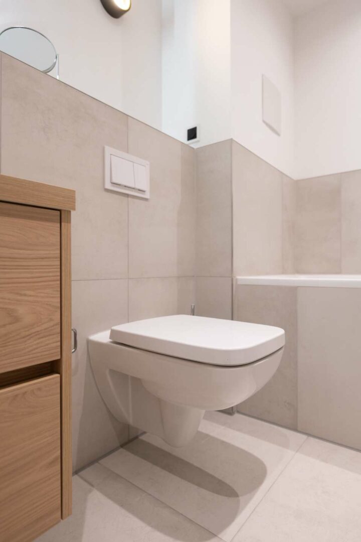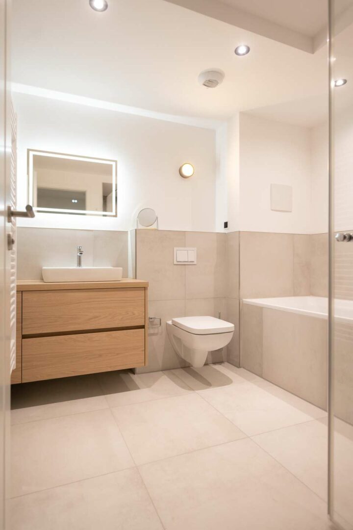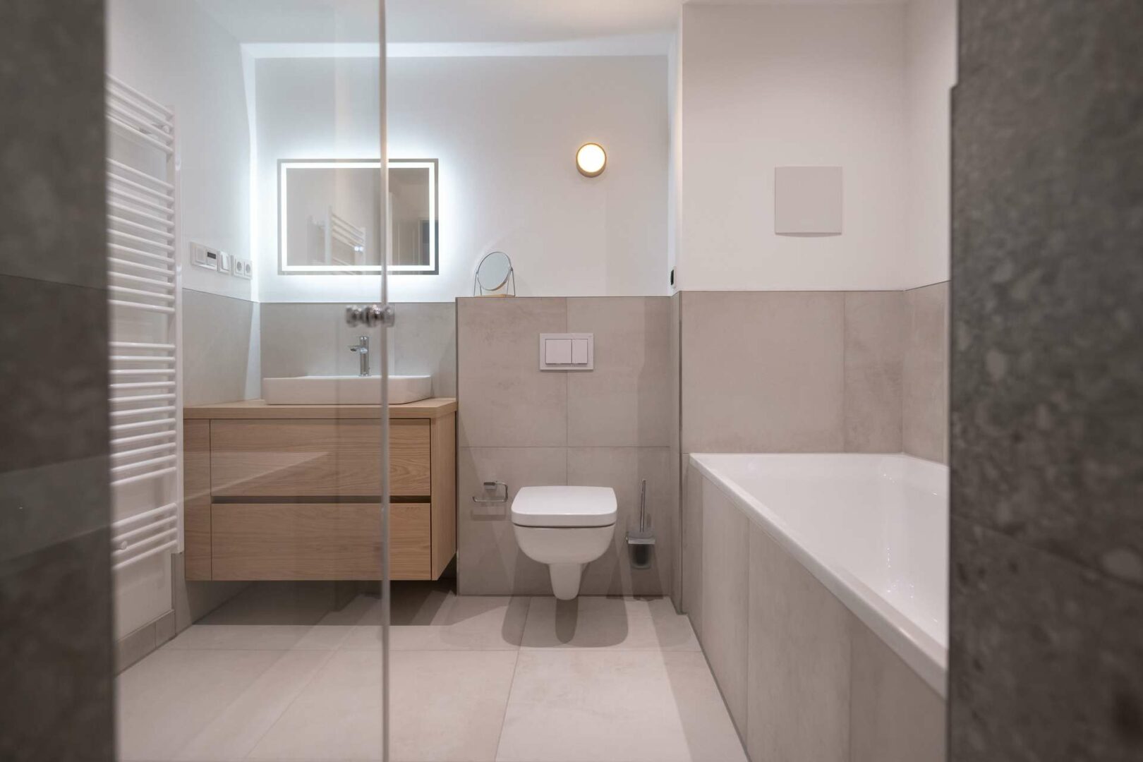 Das Badezimmer überzeugt mit edlen Armaturen und einer bodengleichen Dusche mit deckenhoher Glasabtrennung. Ein zusätzlicher Abstellraum bietet praktischen Stauraum für Haushaltsgegenstände oder persönliche Dinge.
