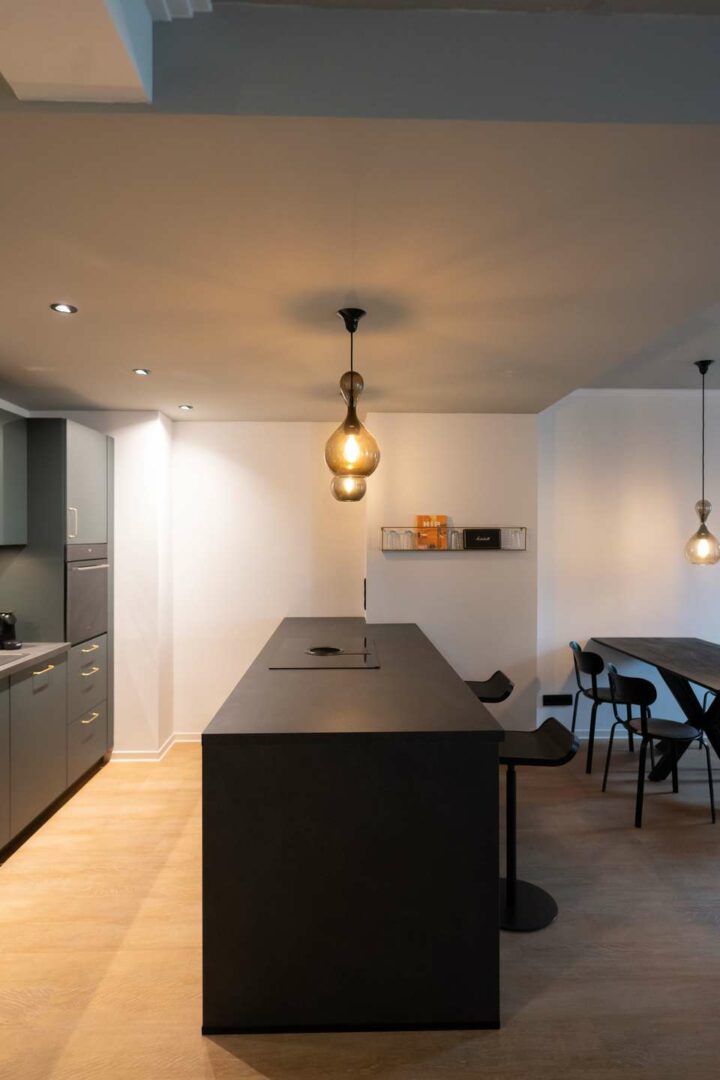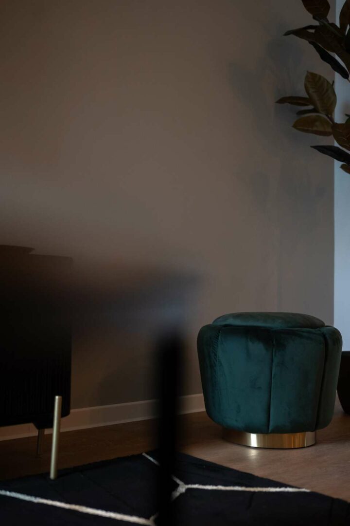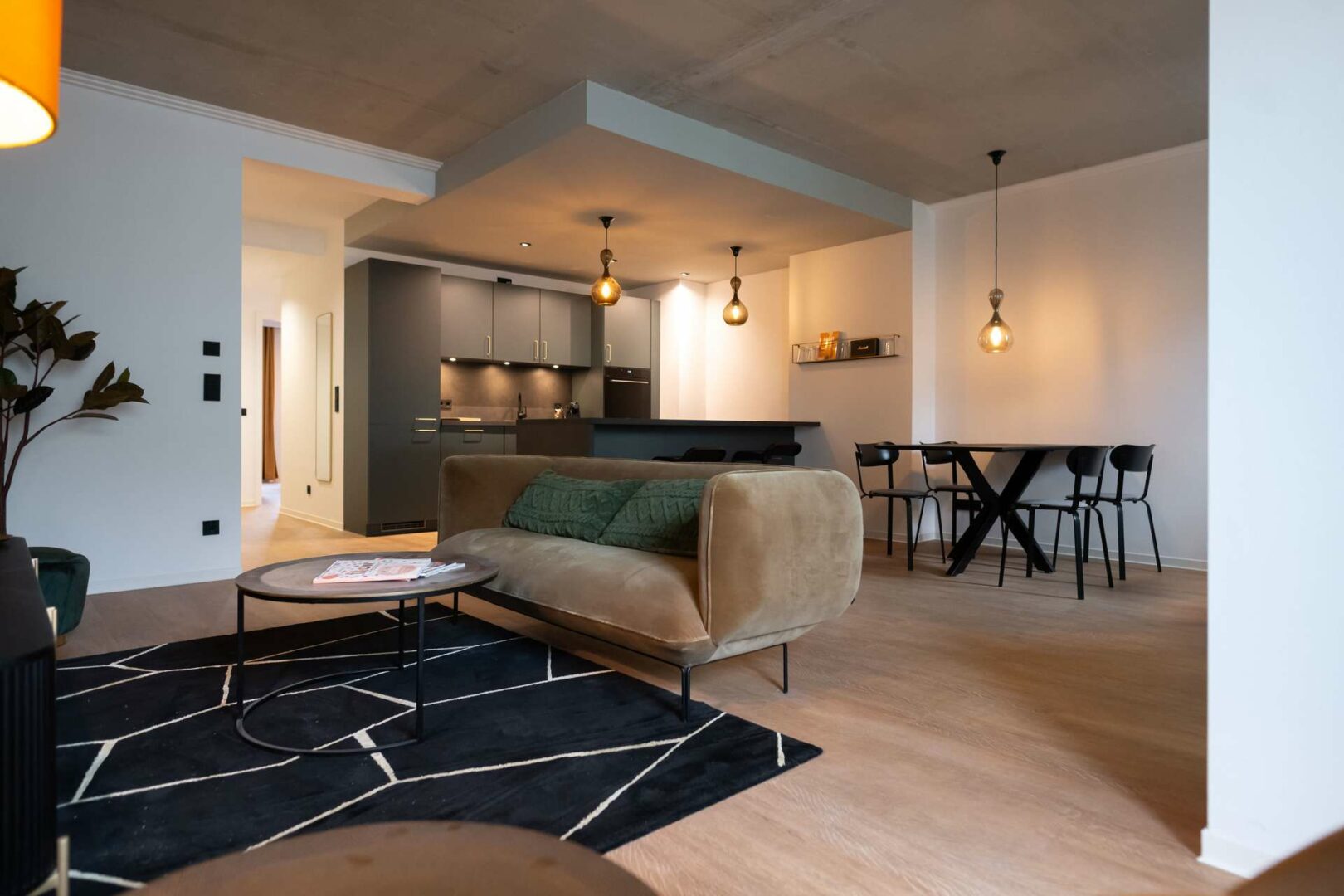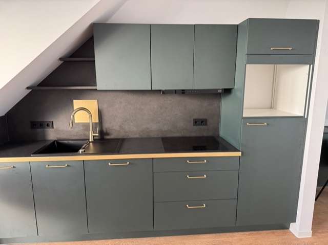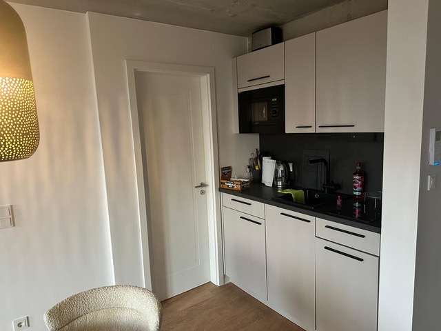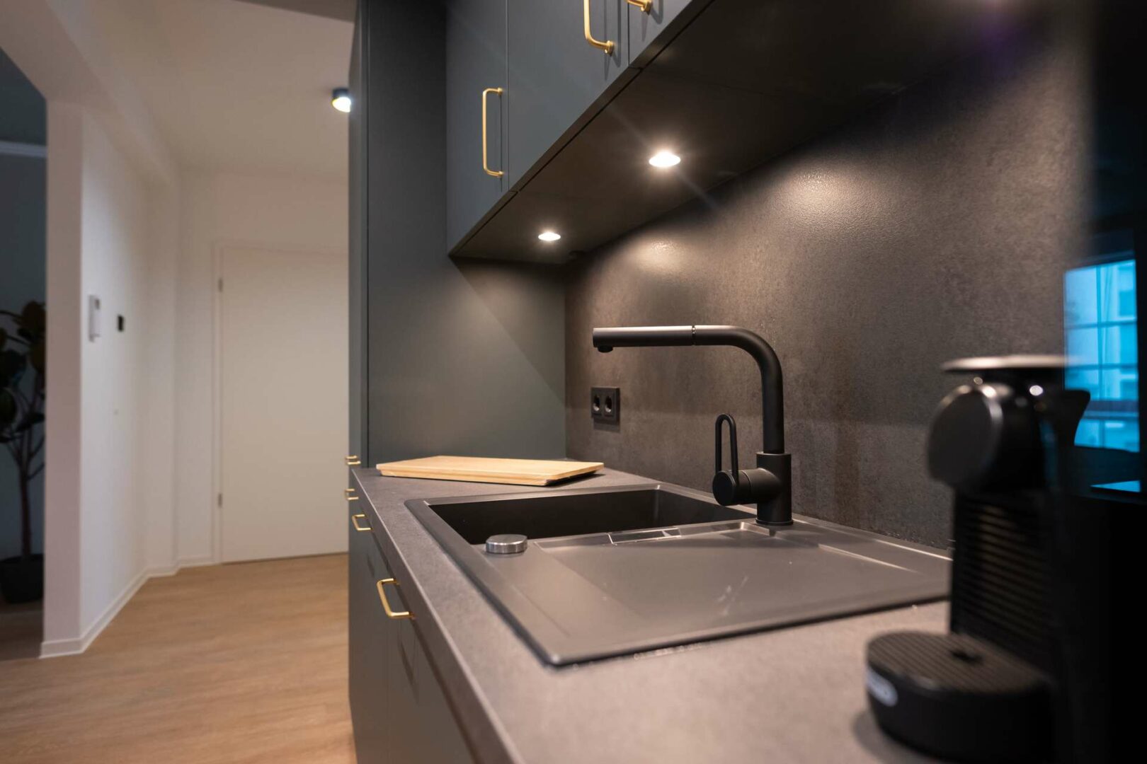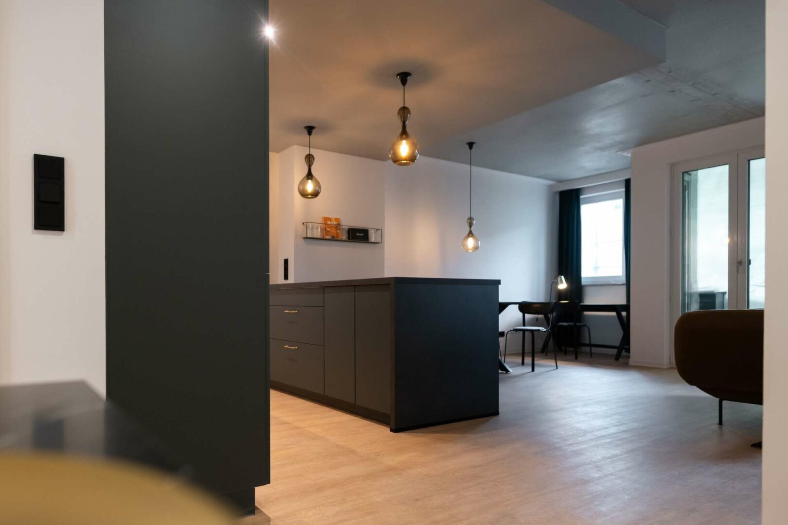 Der helle Wohnbereich ist mit weiß gekalktem Vinylboden ausgestattet und wird durch eine elegante Art-déco-Tapete stilvoll akzentuiert. Die moderne Küche ist harmonisch in den Wohnbereich integriert und erfüllt höchste Ansprüche an Design und Funktionalität.